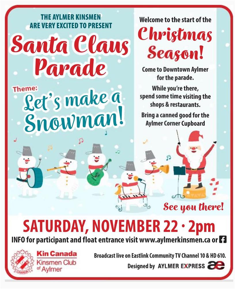 Kinsmen Club of Aylmer presents the Aylmer Santa Claus Parade! Saturday November 22, 2025 starting at 2pm.